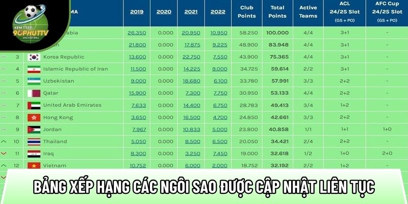 Bảng xếp hạng các ngôi sao bóng đá được cập nhật liên tục